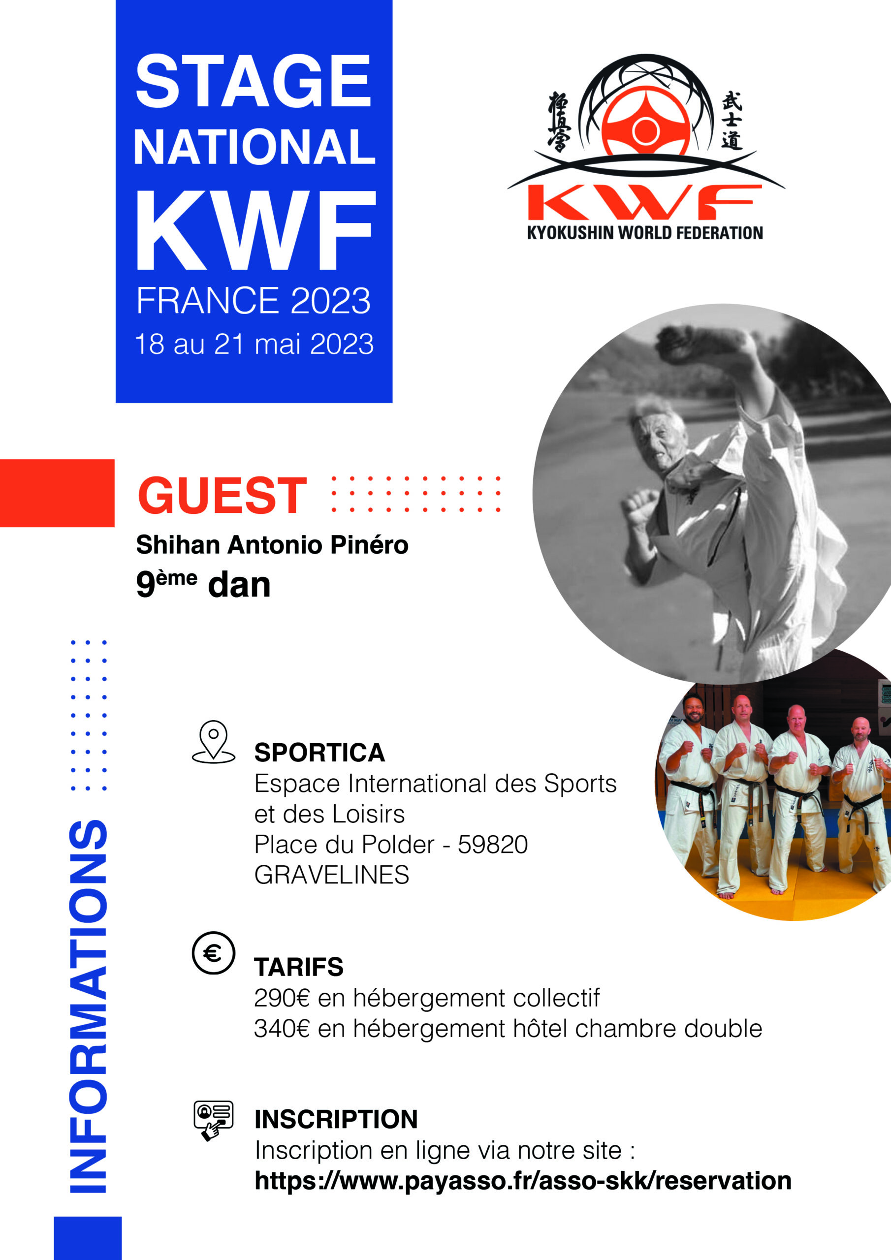 DétailsOuverture des inscriptions pour le Stage National `Kyokushin KWF France du 18 au 21 mai 2023 à Sportica Gravelines avec cette année la participation exceptionnelle de Shihan Antonio PINERO- 9ème…